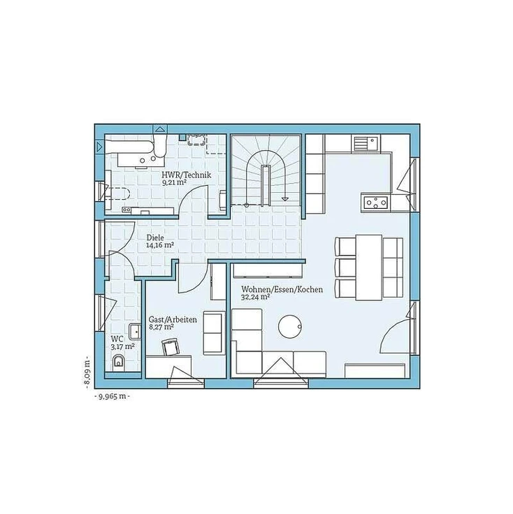Im Erdgeschoss befinden sich der großzügige Wohn- und Essbereich mit offener Küche, Technikraum, Gäste-WC sowie ein Zimmer welches als Gäste- oder Arbeitszimmer genutzt werden kann.