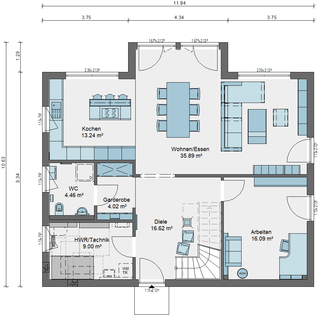 Herzstück des Erdgeschosses ist der großzügige Wohn-, Ess- und Küchenbereich. Große, bodentiefe Fenster öffnen den Raum zum Garten und schaffen eine helle, einladende Atmosphäre – perfekt für gemeinsame Momente mit Familie und Freunden. Ein flexibel nutzbares Gäste- oder Arbeitszimmer, ein Gäste-Bad mit Dusche sowie ein praktischer Hauswirtschafts- und Technikraum ergänzen diese Ebene.